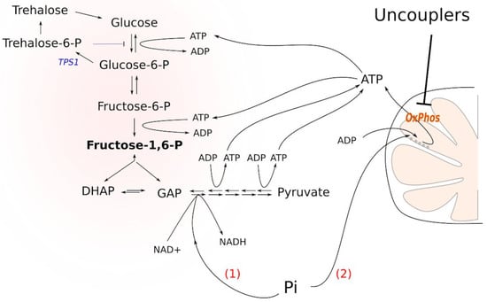 Two routes of inorganic phosphate entry into cell catabolism under glycolysis-overflow conditions induced by TPS1 deletion. (1) Glyceraldehyde dehydrogenase reaction consumes Pi and induces upstream fructose-1,6-bisphosphate processing. This route is expected to alleviate glycolytic block. (2) ATP synthesis via oxidative phosphorylation (OxPhos) consumes Pi; this route can aggravate glycolytic block because ATP contributes to the carbohydrate phosphorylation in the upper glycolysis and drives the synthesis of fructose-1,6-bisphosphate. Uncouplers inhibit the second pathway and, therefore, may increase the assimilation of Pi via the first route.