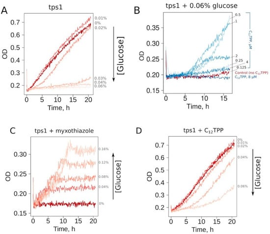 Representative curves show that the addition of a mild uncoupler C12TPP (dodecyltriphenylphosphonium) and the respiration inhibitor myxothiazol both allowed cell growth under these conditions (Figure 2B–D). Notably, the shapes of the growth curves were different: steep followed by flat in the case of myxothiazol (Figure 2C) and the opposite in the case of C12TPP (Figure 2D). Moreover, an increase in glucose concentration prevented C12TPP-induced growth but, on the contrary, stimulated that caused by myxothiazol addition (Figure 2C,D). Importantly, in the case of 0.04% glucose-containing media, C12TPP addition led to a higher final cell density than the addition of myxothiazol (Figure S1).