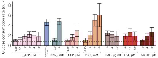 As expected, both FS1 and Kor105 stimulated glucose consumption; the effects were similar to those of C12TPP (Figure 3). Notably, when used at sufficiently high concentrations, some of the lipophilic cations induce steep-followed-by-flat (myxothiazol-like) growth curves (Figure 4). Possibly, in such cases, they act as general poisons. This means that they inhibit ATP production, in this way stimulating glucose consumption and, due to the poisoning, inhibiting the growth.