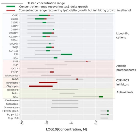 As a proof of principle, we tested a number of uncouplers as well as several other compounds in our system. Figure 4 shows the substances that did display C12TPP-like behavior (flat-followed-by-steep growth curve) in green, the myxothiazol-like ones (steep-followed-by-flat growth curves) in red, and the ones that did not rescue at all in grey. While the ranges of the indicated concentrations for the substances shown in green correspond to flat-followed-by-steep-shaped curves of stimulated cell growth, the addition of higher concentrations of such substances resulted in steep-followed-by-flat growth curves (Figure 2B and Figure 4 and Table S1).