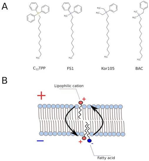 (A) Structural formulas of C12TPP and its analogs with varying degrees of charge shielding by phenyl groups. (B) A scheme illustrating the dissipation of the membrane potential by the lipophilic cations. “+” and “−” correspond to positive and negative electic charge, respectively.