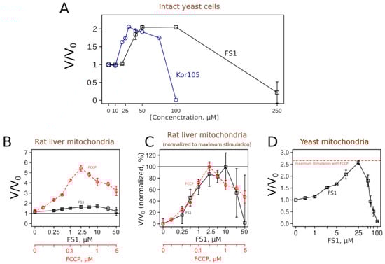 FS1 and Kor105 possess uncoupling activity. Respiration rates of intact yeast cells (A) and isolated yeast mitochondria (D) in the presence of different concentrations of the compounds, expressed as V divided by V0 (V, the rate in the presence of a compound, divided by V0, the rate without addition). (B,C) Stimulation of the respiration of rat liver mitochondria by FS1 and FCCP, absolute values of V divided by V0 and normalized ones (the maximal stimulation by a compound corresponds to 100%; the value without addition, i.e., without stimulation, corresponds to 0%), respectively. Error bars correspond to standard deviations; n = 3.