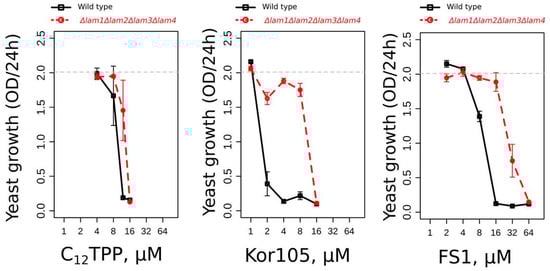 An increase in the plasma membrane (PM) ergosterol protects cells against the lipophilic cations. The graphs show the values of the cell densities grown for 24 h in the presence of the indicated concentrations of the cations. The wild-type and lam1-4-delta (the strain with elevated PM ergosterol) cells are compared on each graph. The cells were grown on YPD (YP-Dextrose) medium. Error bars correspond to standard deviations; n = 3.