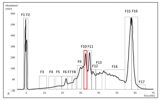 Chromatogram from the first fractionation process (preparative HPLC). Seventeen fractions were isolated. The peak of interest is F10 (RT = 37′49″) (shown in red).