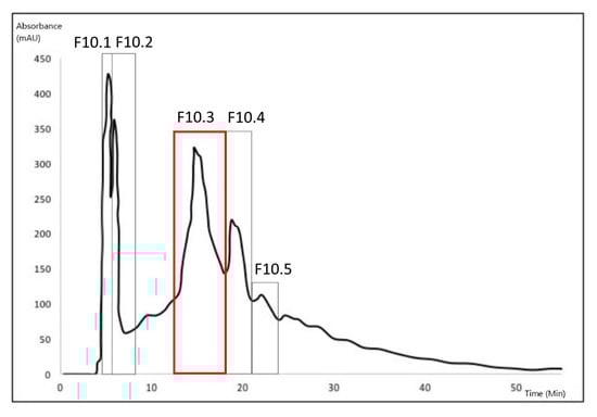 Chromatogram from the second fractionation process (preparative HPLC). Five fractions were isolated. The peak of interest is F10.3 (RT = 14′45″) (shown in red).