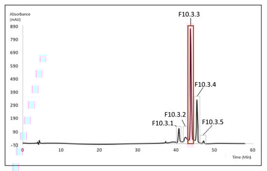 Chromatogram from the third fractionation process (analytical HPLC with fraction collector). Five fractions were isolated. The peak of interest is F10.3.3 (RT = 43′49″) (shown in red).