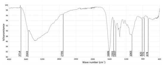 The dry sample was analyzed using a Shimazu IR Affinity-1S FTIR (Nakagyo, Japan) spectrophotometer in transmission mode. The purified powder was placed directly on the diamond in order to establish its IR spectrum. The FT-IR spectrum of the sample was scanned between 4000 and 400 cm−1.