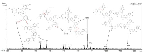 Based on the mass spectrum (Figure 6), signal at 1153.1 m/z corresponded to [M + H]+, indicating a monoisotopic mass of 1152.1 Da for the purified molecule. When compared to the literature, the observed parent ion is in line with the observations of Lv Q. et al., 2015 and Xu X. 2010 [19,20] and suggests a proanthocyanidin tetramer with two B-type bonds and one A-type bond (Figure 8). The following information obtained from the mass spectrum was consistent with that conclusion. Signal at 1001.1 corresponded to the loss of an hydroxyvinylbenzenediol unit [M + H − 152]+, as previously described by Enomoto H. et al., 2020 [21]. The most abundant ion of the mass spectrum (865.2 m/z) was formed by quinone methide fission which caused the loss of the first epicatechin unit linked with a single B-type 5–4′ bond. The 865.2 m/z ion thus corresponded to an epicatechin trimer [M + H − 288]+. Sodium adduct of the latter is also reported at 887.2 m/z [M + Na − 288]+, as well as the formation of an ion resulting from a water molecule loss to the trimer at 847.2 m/z [M + H – 288 − H2O]+. The signal at 713.2 was produced following the loss of a hydroxyvinylbenzenediol unit from the epicathechin trimer [M + H – 288 − 152]+. Specific fragment ions at 575.1 and 865.2 allowed to elucidate the position of the A-type double 5–4’/2-O-3’ (Figure 8) as those fragments are produced when the A-type bond is placed between the second and the third epicatechin units [22,23].