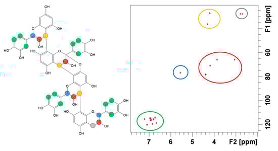- In HSQC, the presence of signals at 4.2; 27 and 4.3; 36 ppm (Figure 7, yellow circle) can be explained if several catechin units are linked together since unpolymerized catechin should only display CH2 signals in this area of the spectrum.