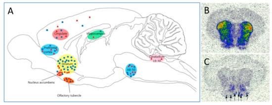 (A) D2Rs (blue circles) and D3Rs (red triangles) show distinct distribution within the rat brain (schematic drawing of the median sagittal section of a rat brain modified from the original image created by Gill Brown (source: neuroscience-graphicdesign.com, license: CC BY-NC 4.0). (B) [3H](+)PHNO binding in rat brain coronal section in the absence Gpp(NH)p visualizes both D2Rs and D3Rs. (C) [3H](+)PHNO binding in rat brain coronal section in the presence of 100 µM Gpp(NH)p allows visualization of only D3Rs. Arrows indicate the islands of Calleja, an area in the olfactory tubercle rich in D3Rs. The remaining binding dorsally to the islands of Calleja in the nucleus accumbens indicates high abundance of D3Rs in this area. Autoradiograms by F. Horti and B. Kiss (unpublished).