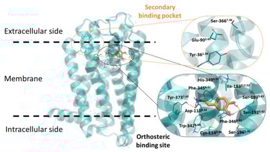 The D3R, similarly to other GPCRs, possesses highly complex dynamics. Although experimental methods for studying GPCR structure and dynamics have advanced dramatically in recent years, a complete description of GPCR dynamics will require far more investigation. The D3R transmits a signal through the cell membrane via conformation rearrangement. Agonists bind to the extracellular side of receptor and favor structural changes that allow G-protein or arrestin to bind to its intracellular surface. Based on comparison of the available active and inactive GPCR structures, the most significant rearrangements occur in the intracellular site, especially in the TM6 region [82,83] and recently 13 state-specific conserved inter-TM interactions were identified [84]. It is possible to stimulate different intracellular signaling pathways independently via biased agonists [85,86] through a single GPCR. Many GPCRs possess secondary (allosteric) binding sites that influence intracellular signaling in distinct manners. The exact mechanism of biased and unbiased agonism is still unclear, but recent work suggests the significance of EL2.52, 5.43 and 6.55 residues (Ile-183, Ser-193 and His-349 in hD3R) in arrestin, and 5.42 (Ser-192 in hD3R) in G-protein biased signaling [87,88].