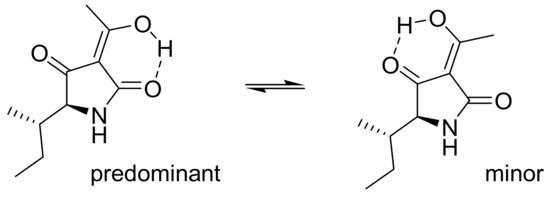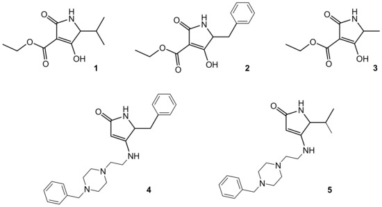 Ethyl 4-hydroxy-5-isopropyl-2-oxo-2,5-dihydro-1H-pyrrole-3-carboxylate (1). Yield: 51%. m.p. = 100–103 °C. 1H-NMR (300 MHz, CDCl3), δ (ppm): 0.89 and 1.05 (2 d, 3H + 3H, CH3CCH3); 1.39 (t, 3H, CH3C); 2.17–2.24 (m, 1H, CCHC); 4.08 (d, 1H, NHCH); 4.36–4.44 (q, 2H, CCH2). ESI-MS m/z: 214 [M + 1]+. HRMS (C10H15NO4+Na+): calculated: 236.0893 found: 236.0893.