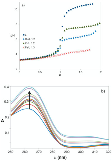 Figure 4. (a) Potentiometric titration curves of compound 1 (I = 0.1 M KCl, T = 25.0 ± 0.1 °C, CL = 6.7 × 10−4 M) and corresponding 1:3 Fe(III)/1 and 1:2 M((II)/1 (M(II) = Cu(II), Zn(II)) systems in 15% w/w DMSO/water (a represents moles of added base per mole of ligand); (b) Spectrophotometric absorption spectra of compound 1 (2.49 < pH < 6.95) (CL = 4.0 × 10−5 M, 15% DMSO/water) [28]. The arrow shows spectra evolution when pH increases.