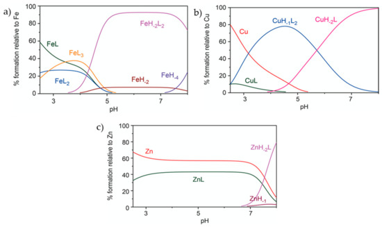 Figure 8. Species distribution curves for the systems: (a) Fe3+/1 (1:3) (CL = 4 × 10−5 M), (b) Cu2+/1 (1:2) (CL = 4 × 10−5 M) and (c) Zn2+/1 (1:2) (CL = 6.7 × 10−4 M) in 15% w/w DMSO/water.