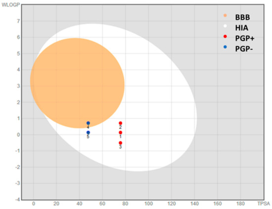 Moreover, this assumption was corroborated further thanks to drug-likeness predictions made with the Brain Or IntestinaL EstimateD permeation method [48], which suggested that all studied compounds are well absorbed in the gastrointestinal tract due to their lipophilicity and polarity (measured by WLOGP and TPSA, respectively), shown in the white ellipse of the BOILED-Egg plot (see Figure 13). This graph confirms that compound 4 (and probably 5 as well) might be able to pass the blood-brain barrier and could therefore be active in the Central Nervous System. Consequently, these molecules can be definitely considered as promising hit compounds in view of a future structure–activity relationship study.