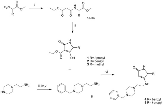 Tenuazonic (TA) congeners and Tenuazonic-Donepezil (TA-DNP) hybrids were synthesized as racemic mixtures according to Scheme 1. In particular, starting from commercial aminoacids and ethyl malonyl chloride, we have synthesized the linear intermediates 1a3a, which were subsequently cyclized in presence of sodium ethoxide under reflux to afford 13 [23,24,25,26,27,28]. Compounds 4 and 5 were obtained through reaction of 1 and 2, respectively, with the crucial intermediate 6 [13,23,29]. The intermediate 6 was synthesized starting from the commercial N-aminoethylpiperazine as previously reported [12,29].