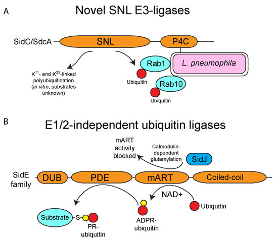 Novel ubiquitin ligases of L. pneumophila. L. pneumophila possesses multiple effectors that exhibit ubiquitin ligase activity but do not show any homology to any known eukaryotic ligases. (A) Novel SNL E3-ligases of L. pneumophila. L. pneumophila injects two paralogous effectors (SidC and SdcA) that possess the SidC N-terminal ubiquitin ligase (SNL) domain, which catalyzes K11- and K33-linked polyubiquitin linkages (in vitro), and direct monoubiquitination of host Rab1 and Rab10. Both effectors associate with the outer leaflet of the LCV membrane via their C-terminal PI4P binding domain. SidC/SdcA contribute to ER-derived vesicle recruitment to the LCV. The SNL domain has not been found in eukaryotic ubiquitin ligases. (B) E1/2-independent ubiquitin ligases of L. pneumophila. The E1/2-independent ubiquitin ligases of the SidE family are the first known ubiquitin ligases that function completely independently of the canonical activity of the E1 and E2 enzymes. The mART domain of the SidE family catalyzes the formation of ADP-ribosylated ubiquitin using NAD+ as a substrate. The PDE domain of the SidE family can then use ADP-ribosylated ubiquitin to add phosphoribosylated-ubiquitin to serine residues to substrate proteins, such as host Rab proteins and Rtn4. Activity of the SidE family is regulated by the metaeffector, SidJ, which catalyzes calmodulin-dependent glutamylation of the mART domain, and this blocks activity of this domain.