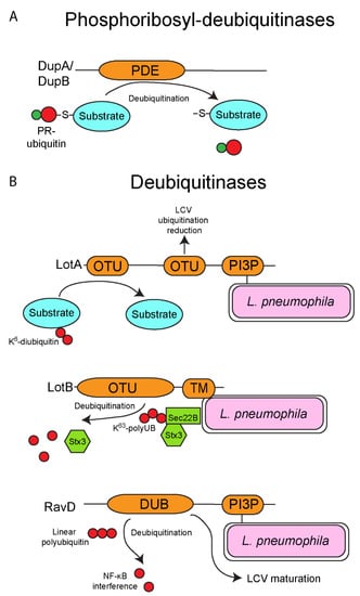 Deubiquitinases of L. pneumophila. Besides possessing several ubiquitin ligase, L. pneumophila also injects into the cytosol of host cells several deubiquitinases. (A) Phosphoribosyl-deubiquitinases of L. pneumophila. The SidE family-dependent phosphoribosyl-ubiquitination of proteins can be reversed by the deubiquitinase activity of the two injected effectors, DupA and DupB. Both DupA and DupB possess a PDE domain homologous to those found in the SidE family, but in contrast these domains catalyze the removal of phosphoribosyl-ubiquitin moieties from substrate proteins. (B) Deubiquitinases of L. pneumophila. L. pneumophila also possesses several deubiquitinases that specifically remove ubiquitin moieties from targeted proteins. LotA harbors two OTU domains and is localized to the LCV outer leaflet via its C-terminal PI3P-binding domain. LotA has been shown to reduce the overall ubiquitination of the LCV, and additionally specifically deubiquitinate proteins that are modified with a K6-diubiquitin moiety, though the functional importance of this effector is unknown. Similar to LotA, LotB also harbors an OTU domain and has a C-terminal transmembrane domain to allow localization to the LCV membrane. LotB specifically deubiquitinates K63-linked polyubiquitin chains from the host SNARE, Sec22B, resulting in the release of SNARE, Stx3. Finally, RavD harbors a deubiquitinase domain that specifically deubiquitinates linear polyubiquitin chains, and this may disrupt NF-κB signaling. Similar to LotA, RavD has the C-terminal PI3P-binding domain to allow localization of the effector of the LCV membrane.