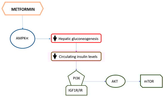 It has already been discussed that hyperinsulinemia increases cancer risk in healthy subjects and can partly explain the obesity–cancer risk association. In this perspective, in the past years, metformin has been extensively studied as a possible anticancer agent. In fact, due to its mechanism of action, metformin might interfere with carcinogenesis through direct and indirect mechanisms (Figure 1 and Figure 2).