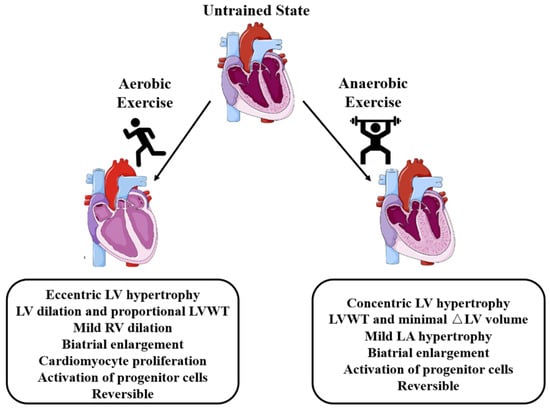 Schematic of exercise-induced cardiac hypertrophy. Aerobic and anaerobic exercise elicits physiological cardiac remodeling. Hypertrophy activation is principally eccentric for aerobic but concentric for anaerobic exercise. LA, left atrium; LV, left ventricle; LVWT, left ventricular wall thickness; RA, right atrium; RV, right ventricle.