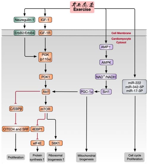 Regarding paracrine factors, insulin-like growth factor-1 (IGF-1) and neuregulin-1 have a specific effect on exercise-induced cardiac regeneration. IGF-1, as a growth factor, is released in response to exercise in animal models and elite athletes [,]. Compared with sedentary individuals, increased cardiac IGF-1 is related to heart physiologic growth in trained competitive soccer players []. IGF-1 binds to IGF-1 receptor (IGF-1R) and mediates exercise-induced cardiac physiological hypertrophy and cardiomyocyte proliferation by initiating a nexus of intracellular signaling [,]. In addition, IGF-1R has also been confirmed to be both necessary and sufficient to mediate physiologic growth in mice [,]. Moreover, IGF-1R and insulin receptor (IR) control the cardiac metabolic adjustment to exercise. For example, cardiac-specific IR-deletion in mice increases oxidative stress and mitochondrial energetic impairment []. Insulin receptor substrate (IRS) deletion attenuates exercise-induced heart growth and metabolic adaption []. The role of IGF-1 up- and down-stream regulators has also been investigated. Notably, phosphoinositide 3-kinase (PI3K)/Akt is the critical pathway that transmits IGF-1 signaling in the context of exercise-induced cardiomyocyte regeneration and heart growth []. This will be discussed in detail in the following sections.