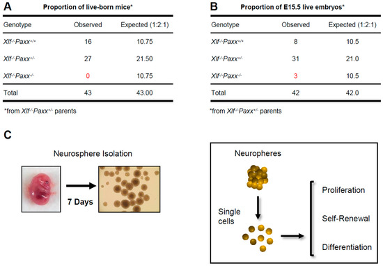 Workflow of the neurosphere-based experiments. (A) Synthetic lethality between Xlf and Paxx in mice. The proportion of live-born mice from Xlf−/−Paxx+/− parents. No Xlf−/−Paxx−/− double knockout live-born mice were observed out of 43 pups analyzed. (B) Fifteen-day-old Xlf−/−Paxx−/− mouse embryos are alive. The proportion of genotypes from Xlf−/−Paxx+/− parents. Three E15.5 Xlf−/−Paxx−/− embryos were detected out of 42 analyzed. (C) Schematic view of the experiment. Embryos were collected at day E15.5 and neural stem and progenitor cells (NSPCs) were isolated from the embryonic brains. Single NSPCs formed neurospheres in cell culture. Every seventh day, the neurospheres were treated with trypsin to obtain NSPCs used to perform the proliferation, self-renewal and differentiation experiments.