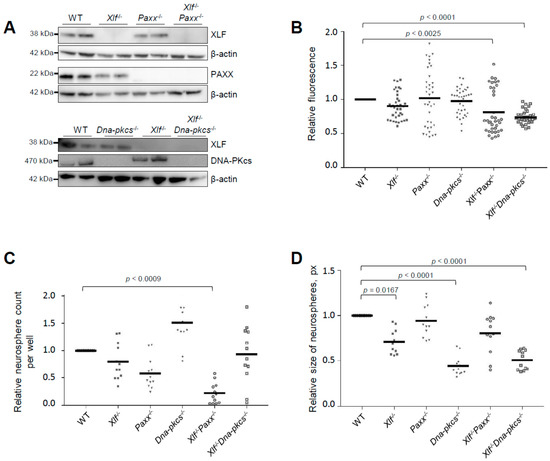 To obtain Xlf−/−Paxx−/− embryos, we intercrossed Xlf−/−Paxx+/− mice. As we observed previously [20], no live-born Xlf−/−Paxx−/− pups were detected (0), while we recorded Xlf−/−Paxx+/+ (16) and Xlf−/−Paxx+/− (27) live-born mice (Figure 1A). By analyzing E15.5 embryos in the same breedings, we detected Xlf−/−Paxx−/− (3), Xlf−/−Paxx+/+ (8) and Xlf−/−Paxx+/− (31) mice (Figure 1B), which were later used for the neurosphere generation and characterization. Xlf−/−Dna-pkcs−/− mice were described earlier [20]. Briefly, by breading Xlf−/−Dna-pkcs+/− mice, we obtained no adult Xlf−/−Dna-pkcs−/− mice (0), while there were Xlf−/−Dna-pkcs+/+ (35) and Xlf−/−Dna-pkcs+/− (54) mice at day P30. However, live-born Xlf−/−Dna-pkcs−/− mice were detected at days P1–2, in line with our previous observations [20,27,28]. We confirmed the lack of protein expression in the knockout cells by western blot (Figure 2A and Supplementary Figure S1).