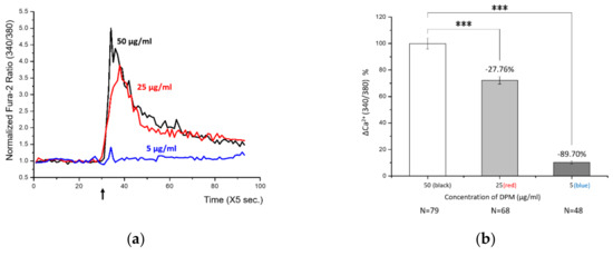Diesel particle matter (DPM) induced transient Ca2+ influx in human bronchial/tracheal smooth muscle (HBT-SM) cells. (a) HBT-SM cells were treated with different concentrations of DPM at the indicated time (arrow), and intracellular calcium (Ca2+) concentration was monitored. Black, 50 μg/mL; red, 25 μg/mL; blue, 5 μg/mL. (b) Highly significant Ca2+ influx by DPM was observed in a concentration-dependent manner. N indicates the number of cells analyzed. (*** p < 0.001).