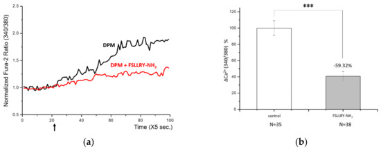Ca2+ signaling upon DPM treatment reminded us of the activation of PAR-2 by matrix metalloproteinase-1 (MMP-1) in human bronchial epithelia [16]. PAR-2 has been reported to activate TRPV4 channels and cause Ca2+ influx as we observed. This led us to check the responsibility of PAR-2 for the results we obtained, and a known synthetic peptide antagonist, FSLLRY-NH2, was employed [27]. HaCaT cells were treated with DPM with or without the antagonist, and DPM-induced Ca2+ influx was decreased by more than 50% by the antagonist (Figure 3a,b). This result demonstrates that PAR-2 is responsible for the calcium signaling of DPM.