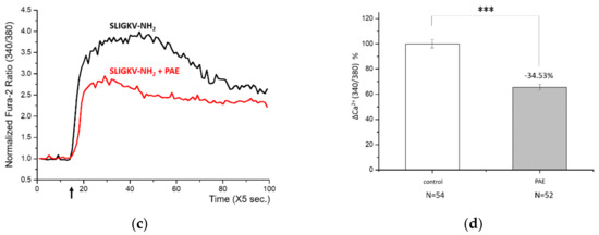 Next, we treated HaCaT cells with a known PAR-2 agonist, SLIGKV-NH2, and it induced Ca2+ influx (Figure 3c,d), correlating with the known effect. When we treated cells with PAE at the same time, the calcium signaling by PAR-2 was significantly reduced while, the agonist constitutively activated PAR-2. Together with the results above, we can conclude that DPM activated PAR-2 and induced Ca2+ signaling, which was suppressed by PAE. It is likely that the regulation of PAR-2 was a direct action of PAE, given that PAE was able to counteract the PAR-2 agonist, albeit partly.