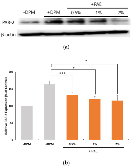DPM and PAE modulated PAR-2 expression in opposite ways. (a) Western blot showed a robust increase in the PAR-2 protein caused by DPM in HaCaT cells, and the treatment with PAE was able to reverse the effect of DPM in a concentration-dependent manner. (b) Transcriptional regulation of PAR-2 was demonstrated to be upregulated by DPM, which could be inhibited by PAE. (* p < 0.05, *** p < 0.001).