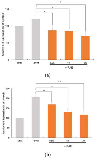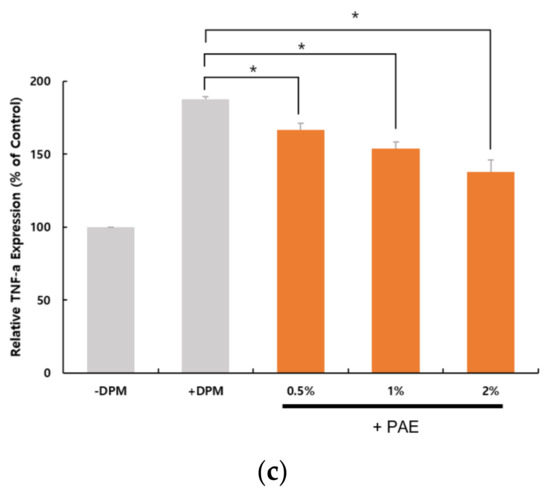 DPM upregulated proinflammatory cytokines and tumor necrosis factor-α (TNF-α). HaCaT cells were treated with DPM only or DPM and PAE. Transcriptional regulation of interleukin-8 (IL-8) (a), IL-6 (b) and TNF-α (c) indicates that DPM induces inflammatory responses, which could be inhibited by PAE in a concentration-dependent manner. (* p < 0.05, ** p < 0.01).