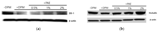 Skin inflammation is often accompanied with skin barrier dysregulation, resulting in various symptoms, e.g., atopic dermatitis or psoriasis [29,30]. Moreover, several studies demonstrated the association of PAR-2 activity with skin health, especially its barrier function [31]. To better understand the skin disorder conditions that DPM may be capable of inducing, we also monitored cell adhesion molecules in HaCaT cells, implicated in the skin barrier integrity. Among desmosomal and tight-junction components, we investigated the protein levels of Zonula Occludens-1 (ZO-1) and Occludin. Western blot analyses displayed consistent reduction of ZO-1 and Occludin upon DPM treatment, indicating potential skin barrier damage (Figure 6). The downregulation of these proteins was reversed by increasing concentrations of PAE, suggesting that PAE could also protect skin barrier integrity from air pollutants.