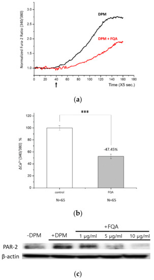 First, we examined the Ca2+ influx by DPM in the presence of FQA. As shown in Figure 7a,b, FQA perfectly reproduced the protecting effect of PAE in HaCaT cells. The effect was concentration dependent, and an amount of 50 ppm was able to inhibit the influx by half to 100 ppm (data not shown). Second, the expression of PAR-2 was investigated. By the increasing amount of FQA, upregulation of PAR-2 by DPM was reversed to the normal status (Figure 7c). This change in PAR-2 level was also confirmed at the mRNA level (Figure S7). With these results, we can conclude that FQA is a major determinant of PAE’s effect on DPM-induced damages, and standardized natural extracts can be used as a dietary supplement or cosmetic ingredient to protect from air pollution.