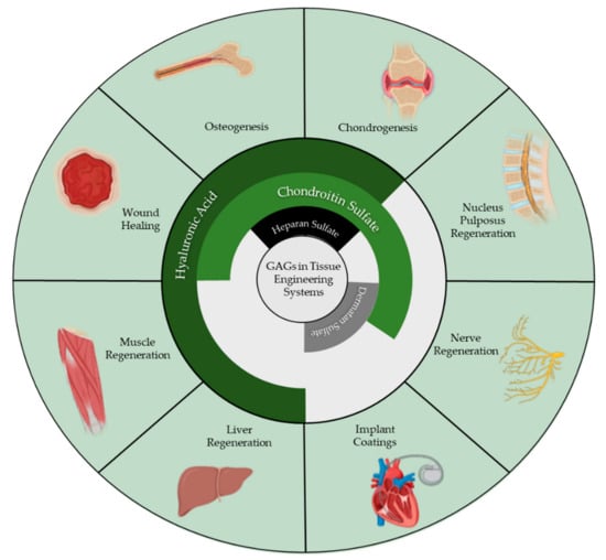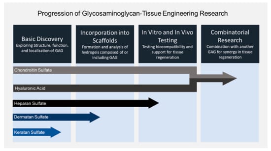 The first research using GAGs in tissue engineering scaffolds arose in the 1980s, with scientists investigating hyaluronic acid as a component of scaffolds for regeneration of tissues. Since then, all GAGs, with the exception of Keratan sulfate, have seen increased utilization in tissue engineering constructs for the treatment of a myriad of diseases such as osteoarthritis, neuropathy, and bone defects, to name a few. This review aims to summarize the use of each GAG in the advancement of tissue engineering in the last five years, depicted pictorially in Figure 2, and project how, as GAGs become more thoroughly understood, their utility and ubiquity in the tissue engineering field will expand.