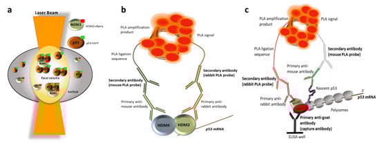 Figure 1. Illustrations of novel techniques used to detect interactions in the p53 pathway. (a) Fluorescence cross-correlation spectroscopy (FCS) used to study the p53-MDM2 interaction in living cells. FCS uses proteins that are labelled independently with different fluorescent probes. Analysis of the FCS data examines minute fluctuations in fluorescence intensity induced by a low number of diffusing labelled molecules, caused by spontaneous deviations from the mean in thermal equilibrium in a confocal configuration [68]. (b) Proximity ligation assay (PLA), used to study the interaction of the p53 mRNA in the RING domain of HDM2 and the formation of the N-terminal HDMX-HDM2 heterodimer. This technique consists of two primary antibodies generated in different species that recognize the proteins of interest and two secondary antibodies that carry oligonucleotide sequences that are ligated and amplified, allowing detection by fluorophores [14]. (c) Proximity ligation ELISA (PLE) set to investigate the trimeric interaction among MDM2 and the nascent p53 peptide on isolated p53 polysomes (via RPL5 or RPL11). PLE involves three primary antibodies. One capture antibody (i.e., from goat), targeting one binding factor and a set of primary antibodies (from mouse and rabbit), targeting two additional binding factors. Upon capturing the trimeric complex via the capture antibody, recognizing one of the binding partners, signal amplification, and detection is performed following the principles of PLA.