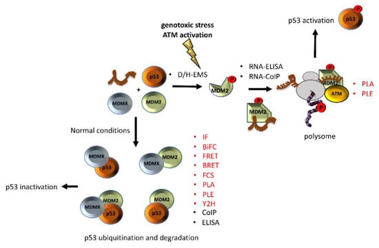 Figure 2. Different techniques have been used to unravel the interaction among of p53-MDM2-MDMX. A phosphorylation on Ser 395 of the MDM2 change its conformation and allow the binding of the p53 mRNA that results in increased p53 protein synthesis after DNA damage. On the other hand, under normal conditions, interaction of MDMX and/or MDM2 with p53 negatively controls the p53 levels. Techniques that allow us to study the interactions in-situ are shown in red.