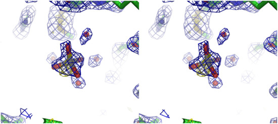 Figure 1. Cross-eye stereo representation of the electron density detail of the mononuclear titanium species and its environment. Water molecules are represented as red spheres. In blue is the 2Fo-Fc contoured at 1.2 σ level, and in yellow is the anomalous difference map contoured at 3.0 σ value. - (iii)