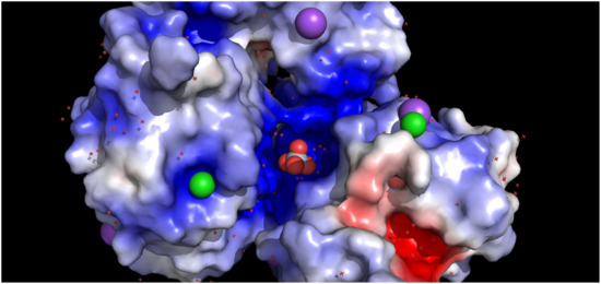 Surface representation (calculated with PyMOL APBS plugin) of the environment in which the titanium species is found, colored by electrostatic potential showing chloride ions in green and sodium in purple.