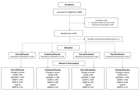Mechanisms between IGFBP-1, phIGFBP-1, and MMP-8 and probiotics and/or fish oil are not known in detail. Probiotics may affect the protein synthesis of IGFBPs [], while n-3 LC-PUFA stimulate MMP production via prostaglandin production []. Other possible mechanisms may relate to the short chain fatty acid production of probiotics and anti-inflammatory properties of fish oil as suggested by Yan et al. [] and by Gholamhosseini et al. [], respectively. To our knowledge, not much is known about the dietary regulators of IGFBP-1 and MMP-8. One study showed that carbohydrates, plant protein and milk protein were directly associated with IGFBP-1 [], and protein restriction has been shown to decrease the levels of IGFBP-1 []. Regarding MMP-8, the studies investigating the impact of diet on MMP-8 are lacking. Previously, we investigated phIGFBP-1, IGFBP-1 and MMP-8 in smaller number of pregnant women (n = 100) and we found that polyunsaturated fatty acids correlated directly with IGFBP-1 and potassium and pyridoxine inversely with MMP-8 [].