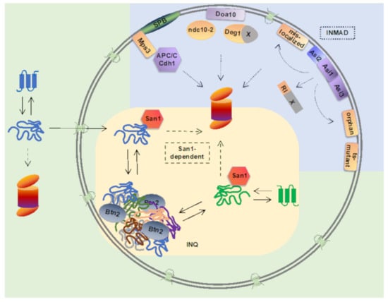 - Amm, I.; Wolf, D.H. Molecular mass as a determinant for nuclear San1-dependent targeting of misfolded cytosolic proteins to proteasomal degradation. FEBS Lett. 2016, 590, 1765–1775. [Google Scholar] [CrossRef]