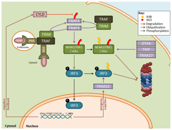 Apart from the NF-κB transduction pathway, ubiquitination is also a key regulatory mechanism for IFN production in response to viruses. As illustrated in Figure 3, one central component in this signalling cascade is the NEMO-TBK1/IKKε complex which catalyses the phosphorylation of the transcription factors IRF3 and/or IRF7 for nuclear translocation. The assembly of NEMO-TBK1/IKKε requires the generation of multiple non-proteolytic ubiquitin chains. These include notably K63-linked polyubiquitin chains catalysed by the E3 ubiquitin ligase TRAF3 following recognition of viral products by some intracellular TLR, such as TLR3. TLR7, TLR8 or TLR9, and/or RIG-I-like receptors [84,85,86].