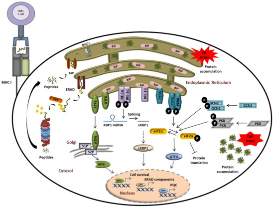 The UPS plays a central role in alerting and resolving imbalances of protein homeostasis. Proteostasis disruption is typically characterized by the accumulation of misfolded and/or damaged proteins in the ER lumen which fail to be retro-translocated to the cytosol by ERAD for proteasomal degradation. Protein aggregation in the ER is sensed by the three ER receptors IRE1α, ATF6, and PERK which then undergo activation to trigger the UPR. This ultimately results in the activation of transcription factors ATF6, sXBP1, and ATF4, thereby promoting the transcription of genes coding for proteins destined to compensate the burden of unfolded/damaged proteins. Perturbed protein homeostasis is also sensed in the cytosol by GCN2 and PKR which undergo autoactivation following amino acid deficiency and stress granules, respectively. Both of these kinases phosphorylate eIF2α, thereby intersecting with the PERK-mediated pathway of the UPR.