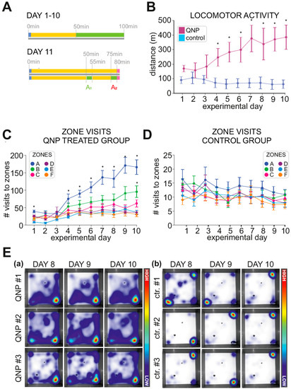 Next, we compared the number of visits (dependent variable) among zones (A–F), treatments (QNP/control), and days (1–10) using GMM. We found a significant 3-way treatment–zone–day interaction (p < 0.001). In QNP treated rats, we found that zone A was visited significantly more than any other zone on the day 1 and on the days 4 to 10 (p < 0.001). On the day 10, zone B was more visited than zones C to F (p < 0.05). In the control group, there were no significant differences in the number of visits among zones on any experimental day. Visits to zones are visualized in Figure 1C–E.