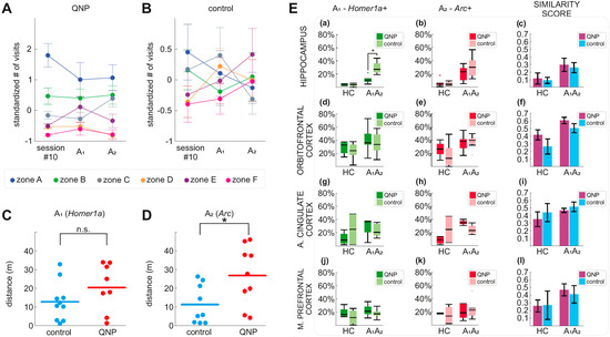 Because IEG expression can reflect an animal’s movement through the environment, we compared the locomotion activity of QNP and control rats during sessions A1 and A2. In session A1, we found no statistically significant difference in locomotion between QNP and control rats (Figure 2C; p = 0.186). In session A2, QNP rats displayed significantly higher locomotion than control rats (Figure 2D; p = 0.025).