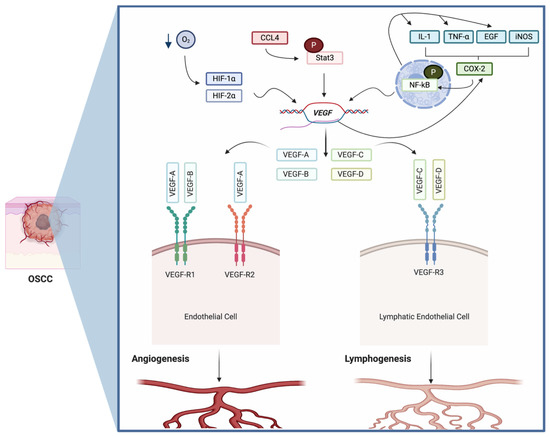 Role of VEGF signaling in OSCC. VEGF is constitutively expressed in oral squamous cell carcinoma. Its secretion can be the result of the activation of different signaling pathways, which includes: (1) the production of hypoxia inducible and HIF-2α by low oxygen levels, (2) the activation of Stat3 by CCL4 (which is constitutively expressed in OSCC) and (3) the activation of COX2 by different inflammatory molecules (commonly overexpressed in OSCC) which activate the NF-kB pathway. The activation of these pathways leads to the transcription of all four variants of VEGF (A–D), which through the activation of VEGF-R1, VEGF-R2 and VEGF-3 on blood and lymphatic endothelial cells, induces angio- and lymphogenesis. Created with BioRender.com.