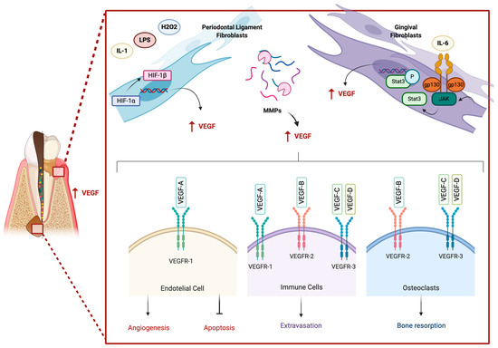 Role of VEGF in inflammatory periodontal diseases. During inflammatory periodontal diseases VEGF transcription can be induced by the activation of two pathways: (1) in periodontal fibroblasts IL-1, LPS and reactive oxygen species (H2O2) may induce the transcription of VEGF through the activation of the HIF/VEGF pathway. (2) The formation of the complex IL-6/IL-6R/gp130 may activate JAK/STAT pathway enhancing the secretion of VEGF by gingival fibroblasts. Also, VEGF might be released through the MMP-mediated proteolytic cleavage from its cryptic forms from the extracellular matrix. These cellular pathways might result in the following effects: VEGF in endothelial cells inhibits apoptosis and VEGF-A/VEGFR-1 interaction induces angiogenesis in immune cells, VEGFs participates in leukocytes’ extravasation and in osteoclasts VEGFR-2/-3 are associated with alveolar bone resorption. Created with Biorender.com.