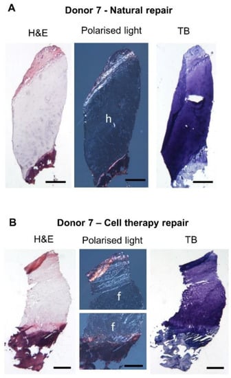 Representative histology images of cartilage repair biopsies from the same donor. Natural repair (A) and cell therapy repair (B) cryosections were stained with haematoxylin and eosin (H&E) to assess general morphology and toluidine blue (TB) to assess proteoglycan content; both samples demonstrated good to excellent matrix metachromasia. Polarised light was used to assess collagen fibre orientation and determine tissue morphology. The natural repair cartilage demonstrated a mostly hyaline (h) morphology whilst the cell therapy repair cartilage was mostly fibrocartilage (f). Scale bars 500 μm.