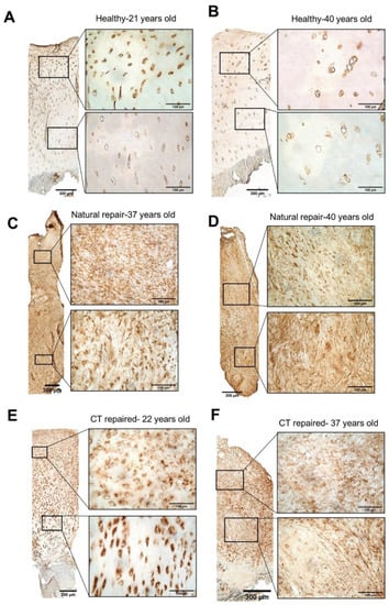 In healthy articular cartilage, collagen type III has a diffuse localisation in the territorial regions around the chondrocytes, i.e., beyond the pericellular capsule []. We found this pattern only in the repair tissues where some hyaline-like cartilage was present, suggesting more matured repair or regeneration. Collagen type III is often associated with collagen type I and is abundant in damaged tissues that are attempting to repair [,].