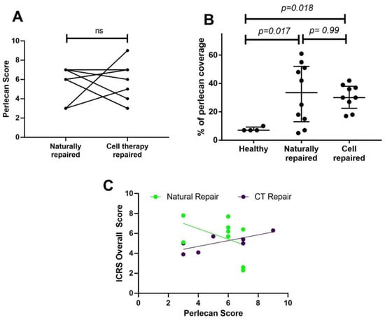 The perlecan immunohistochemistry scores were similar between the two repair tissues, with no noticeable trend when comparing individual donor-matched samples (Figure 3A). Image analysis of the percentage of perlecan staining in the tissues showed that naturally repaired and cell therapy repaired cartilage had significantly more staining than the healthy tissues (p = 0.017 and p = 0.018, respectively, Figure 3B). Interestingly, an increase in the perlecan score significantly correlated with a better-quality cell therapy repair, as defined by the ICRS II ‘overall score’ parameter (r = 0.75, p = 0.03, Figure 3C). Perlecan was also strongly localised around small blood vessels that were visible in 6 of the 10 naturally repaired. No blood vessels were observed in either the cell therapy repaired cartilage samples, or the healthy cartilage.